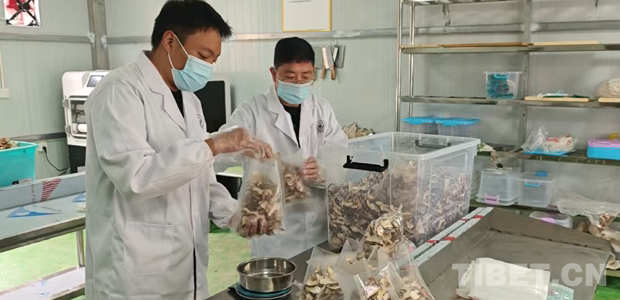 圖為駐村工作隊(duì)和村兩委在扎西村松茸加工廠包裝松茸干片