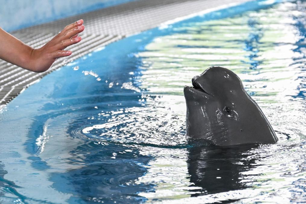 在位于湖北省武漢市的中國科學(xué)院水生生物研究所長江江豚繁育研究中心,訓(xùn)練員給長江江豚喂食。新華社記者 杜子璇 攝