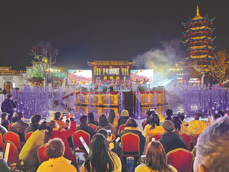 在湖北省云夢縣博物館里,古老藏戲與千年秦簡隔空對話;在祥云灣文旅景區(qū)音樂噴泉舞臺上,《吉祥昂仁》藏戲舞演員宛如格?;ㄊ㈤_在水光瀲滟間;在楚王天下大舞臺上,《大鵬山》六弦琴音雄渾豪邁、舞步粗獷奔放,將神山的巍峨與雪域的壯闊搬到江漢平原;在胡金店萬畝油菜花海中,《多彩的哈達》為春日花海增添了濃郁的民族風情;在安陸、孝昌等周邊縣市,《同心結·幸福緣》舞蹈節(jié)奏歡快、《日喀則我為你牽掛》三重唱旋律悠揚,將高原遼闊與南國柔美完美融合……