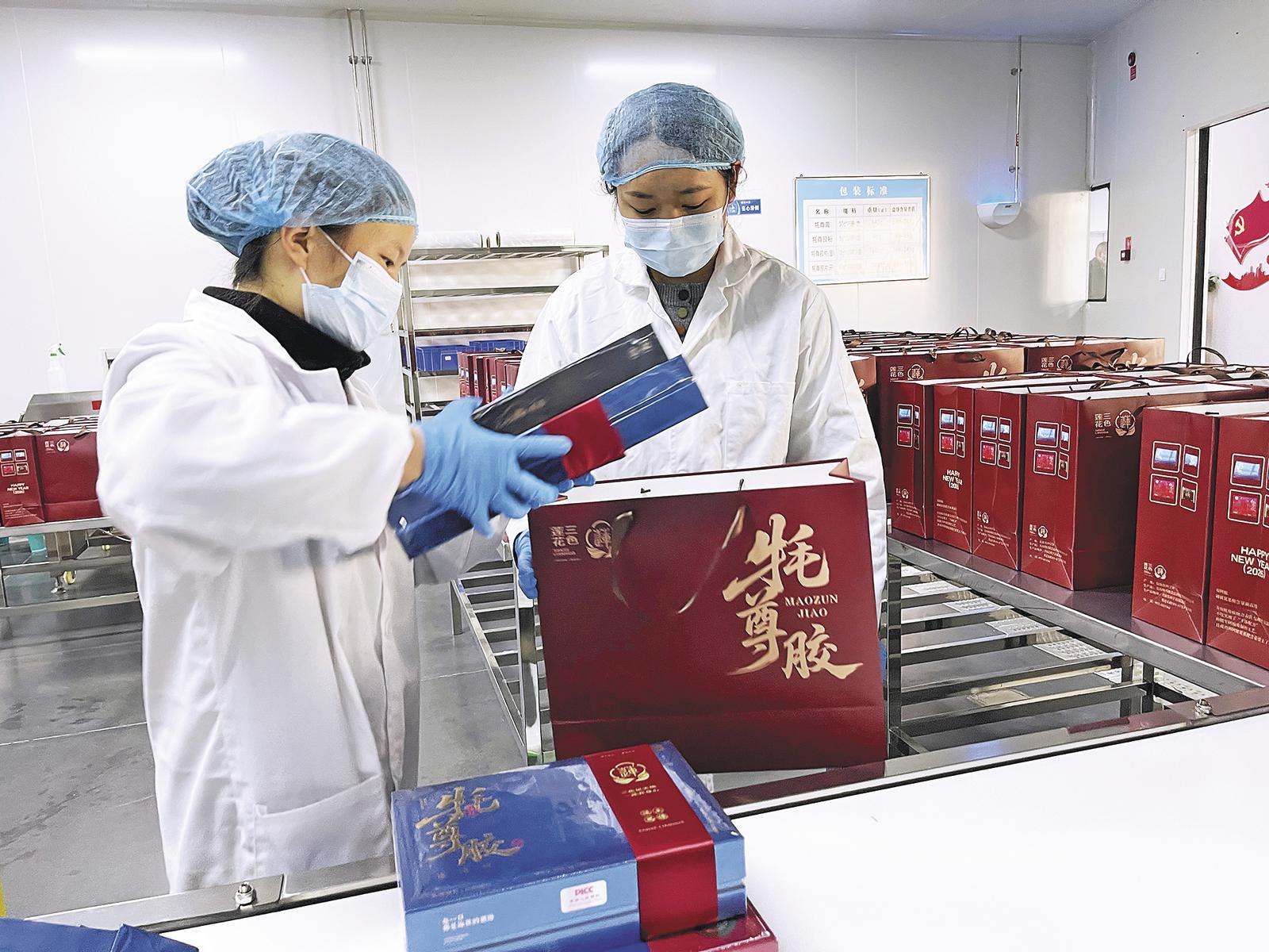 在包裝車(chē)間,幾名工人正將封裝好的牦牛阿膠禮盒整齊碼放,印有“牦尊膏”“牦尊源膠”字樣的精美包裝盒,透著高原產(chǎn)品特有的質(zhì)感。