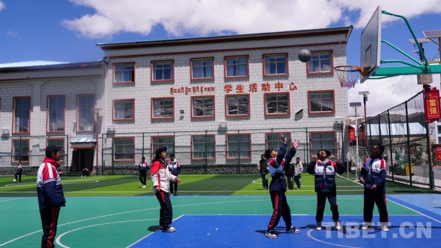 錯那市中學的學生們課間打籃球