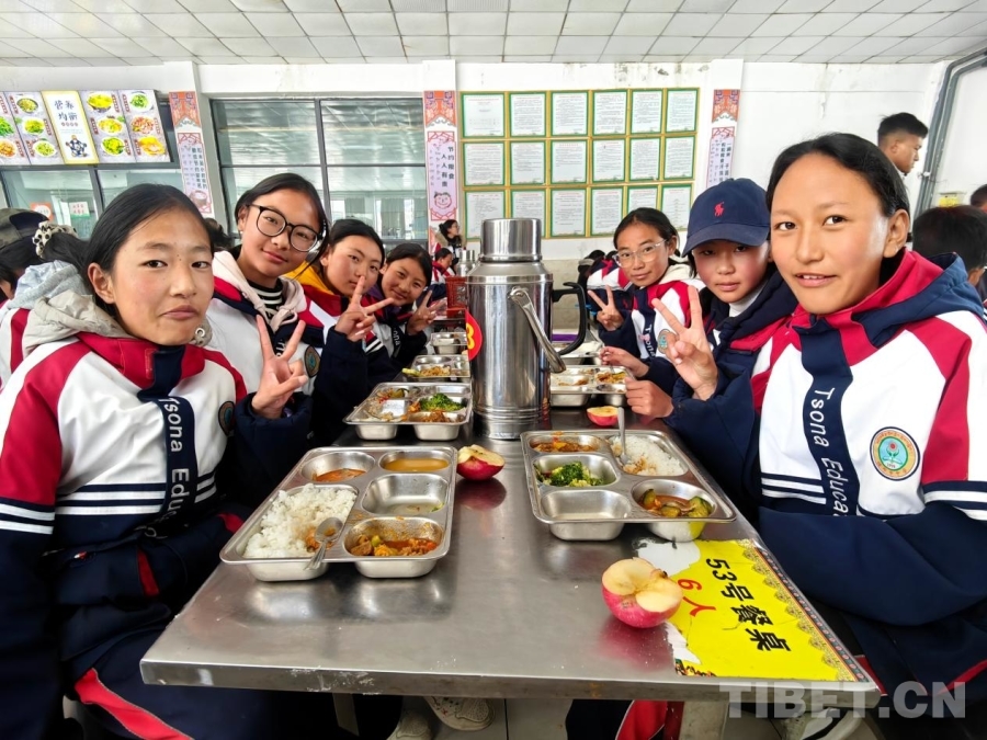 錯那市中學的學生們吃飯時主動向記者提出合影