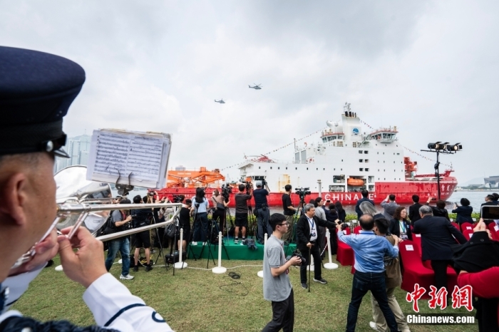 這次,香港更是以“海陸空”上陣歡迎“雪龍2”號到訪香港。在“雪龍2”號不遠處,兩艘拖船和一艘消防船在碼頭附近對射水柱,形成水拱門。香港飛行服務隊的直升機飛過維多利亞港上空示意致敬,香港警察銀樂隊在現(xiàn)場奏樂,九龍巴士車隊貼上歡迎“雪龍2”號標志,還有舞獅隊歡迎“雪龍2”號來到香港。