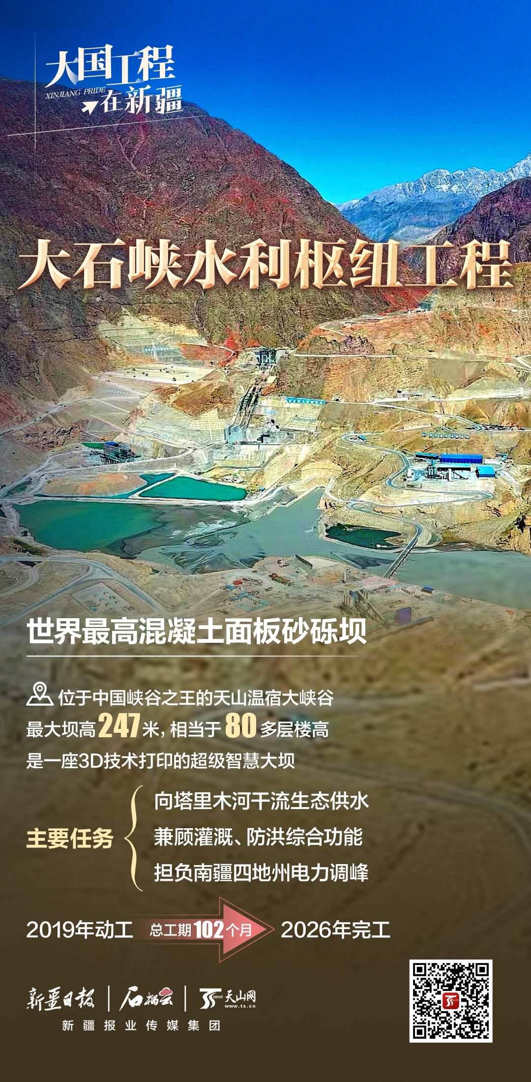新疆大石峽水利樞紐工程建在號(hào)稱(chēng)中國(guó)峽谷之王的天山溫宿大峽谷之中,攔河壩主壩為混凝土面板砂礫石壩,最大壩高247米,壩頂長(zhǎng)度606米,比三峽大壩還高62米,是當(dāng)之無(wú)愧的天塹工程。