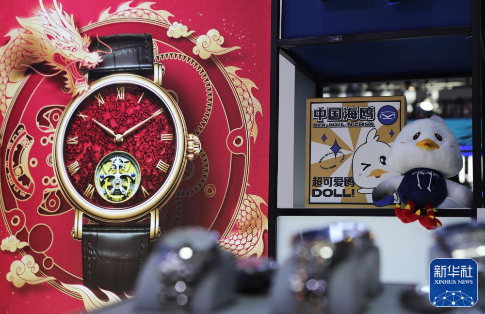 圖為天津館海鷗國潮風(fēng)格手表展柜。本屆消博會上,“老字號”帶來的國潮新品不僅有著海派文化和傳統(tǒng)文化元素,還與獨(dú)具匠心的年輕創(chuàng)意相融合。