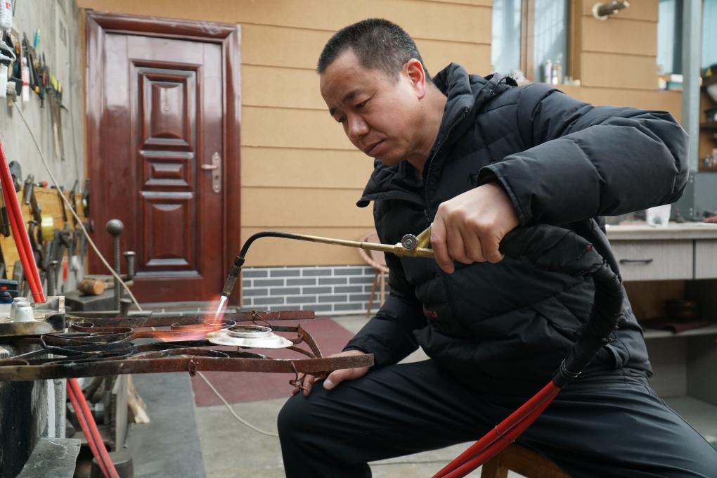王富邦居住的青海省西寧市湟中區(qū)魯沙爾鎮(zhèn)陽坡村,是湟中“銀銅器制作及鎏金技藝”發(fā)祥地。100多年前,這里因緊鄰藏傳佛教名寺塔爾寺而成為銀銅器匠人的聚居地。王富邦介紹說:“一開始只是外來的漢族匠人鍛造宗教器物,后來本地的漢、藏、土族群眾也加入進(jìn)來,村莊因‘家家有作坊’而逐漸揚(yáng)名?!?/p>