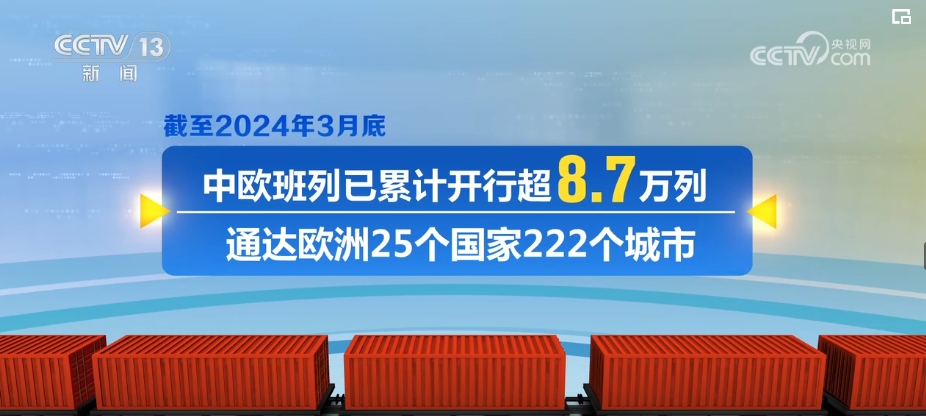 2024年一季度,中歐班列累計(jì)開行4541列、發(fā)送貨物49.3萬(wàn)標(biāo)箱,同比分別增長(zhǎng)9%、10%。截至2024年3月底,中歐班列已累計(jì)開行超8.7萬(wàn)列,通達(dá)歐洲25個(gè)國(guó)家222個(gè)城市。