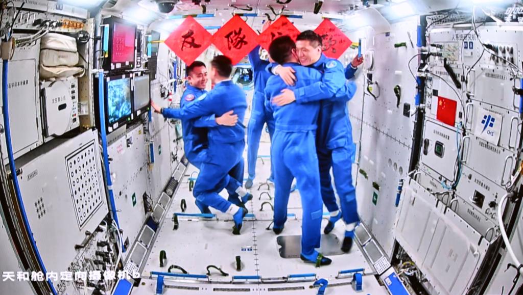 2023年10月26日17時46分,神舟十七號載人飛船成功對接于空間站天和核心艙前向端口。19時34分,神舟十六號航天員乘組順利打開“家門”,歡迎遠道而來的神舟十七號航天員乘組入駐“天宮”。隨后,兩個航天員乘組拍下“全家福”,共同向全國人民報平安。