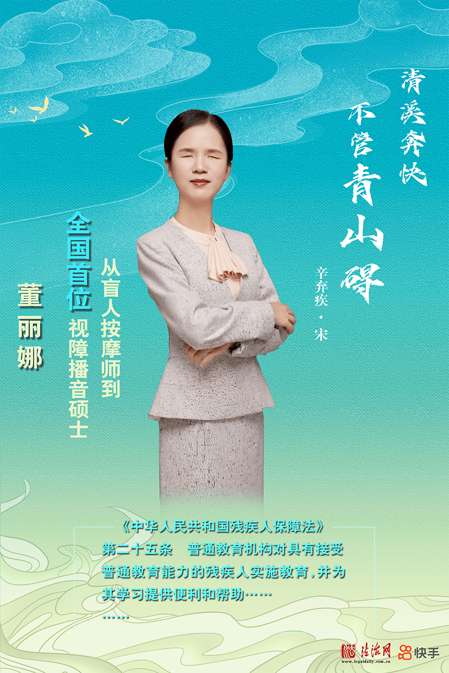 董麗娜先天弱視,10歲失明。但她自強(qiáng)不息、排除萬(wàn)難,在22歲時(shí)爭(zhēng)取到視障人士播音培訓(xùn)機(jī)會(huì),獲得一級(jí)甲等普通話證書(shū),成為《麗娜品讀時(shí)間》的主持人。2020年考入中國(guó)傳媒大學(xué)攻讀碩士學(xué)位,2023年畢業(yè)成為全國(guó)首位視障播音碩士。