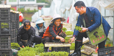 貴州省黔西市雨朵鎮(zhèn)小水井村駐村第一書記符蘭平(右一)向村民了解生產(chǎn)情況。 周訓(xùn)超攝(人民視覺)