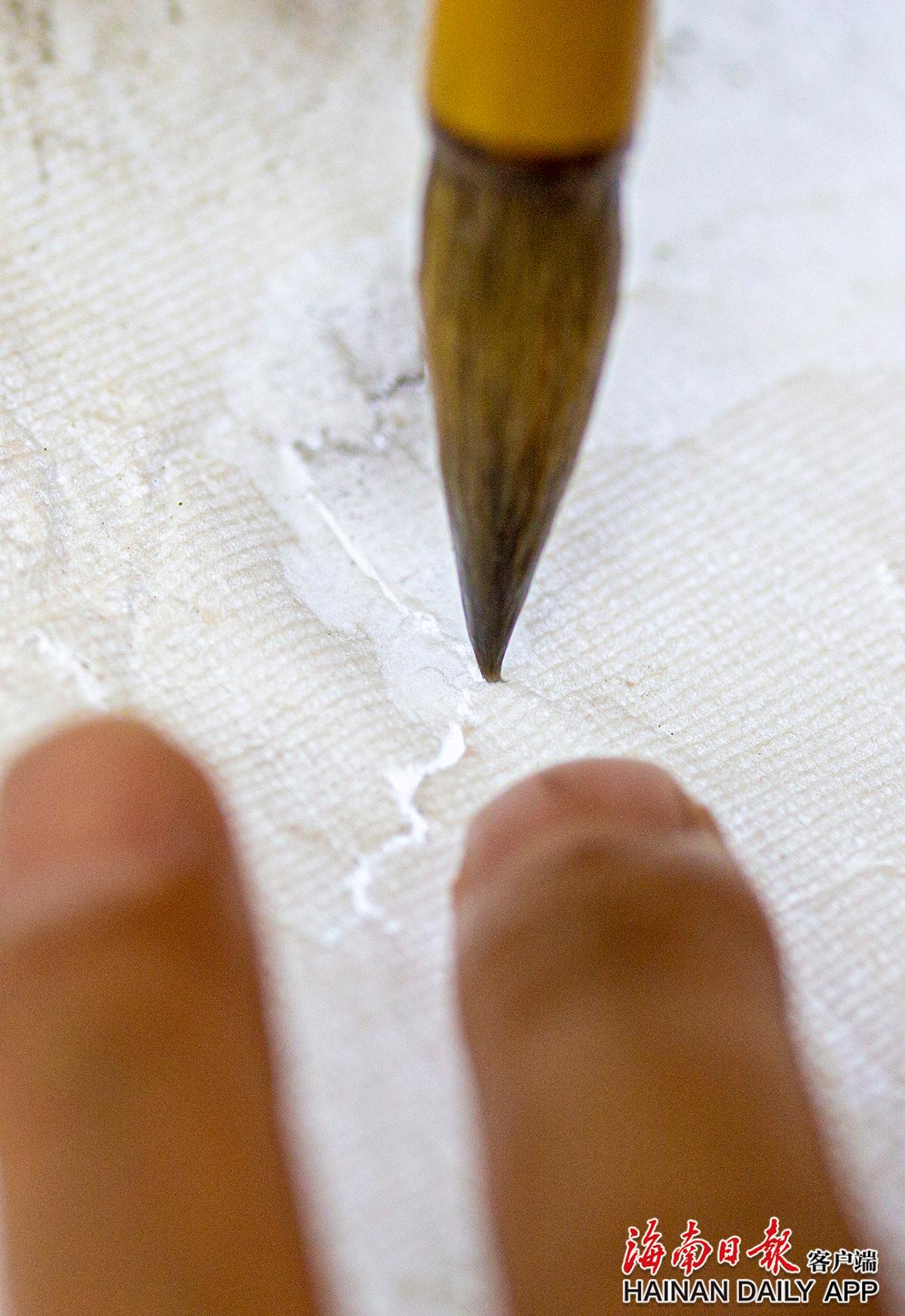 黃文鋒在給古籍補(bǔ)粘紙張 。海南日報(bào)記者袁琛 攝