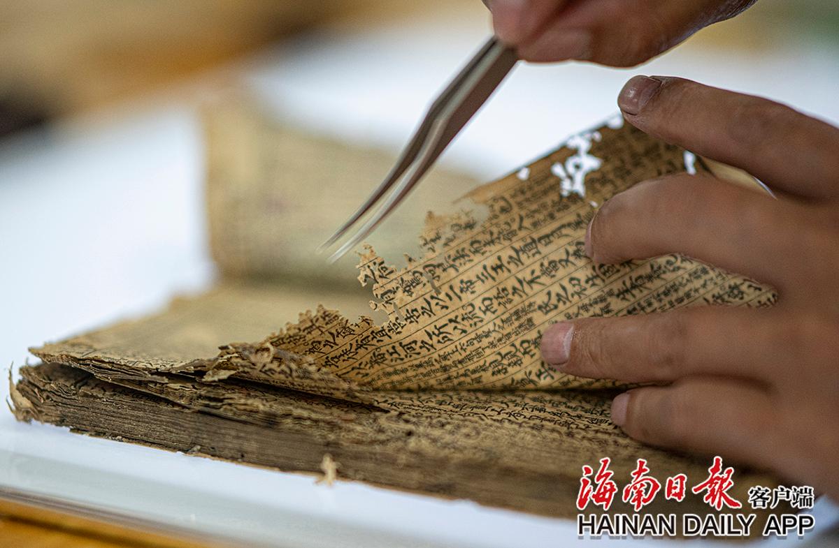 黃文鋒在查看古籍紙張破損情況。海南日報(bào)記者袁琛 攝