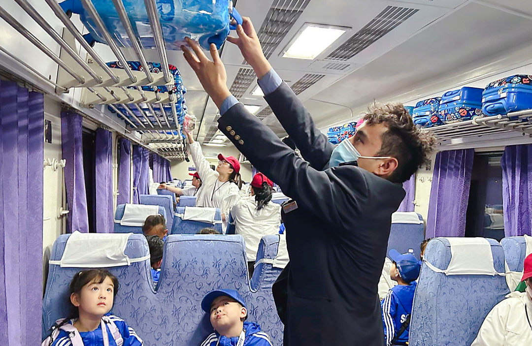開車后,列車長(zhǎng)蔣耀第一時(shí)間和帶隊(duì)老師溝通、了解情況,帶隊(duì)老師說他們一共有53名小學(xué)生、8名老師,從吐魯番“研學(xué)”結(jié)束乘坐火車返回庫爾勒。蔣耀給帶隊(duì)老師講解了兒童乘車安全注意事項(xiàng),又叮囑他們?cè)诼眯衅陂g如遇困難可以找他或乘務(wù)員幫助。
