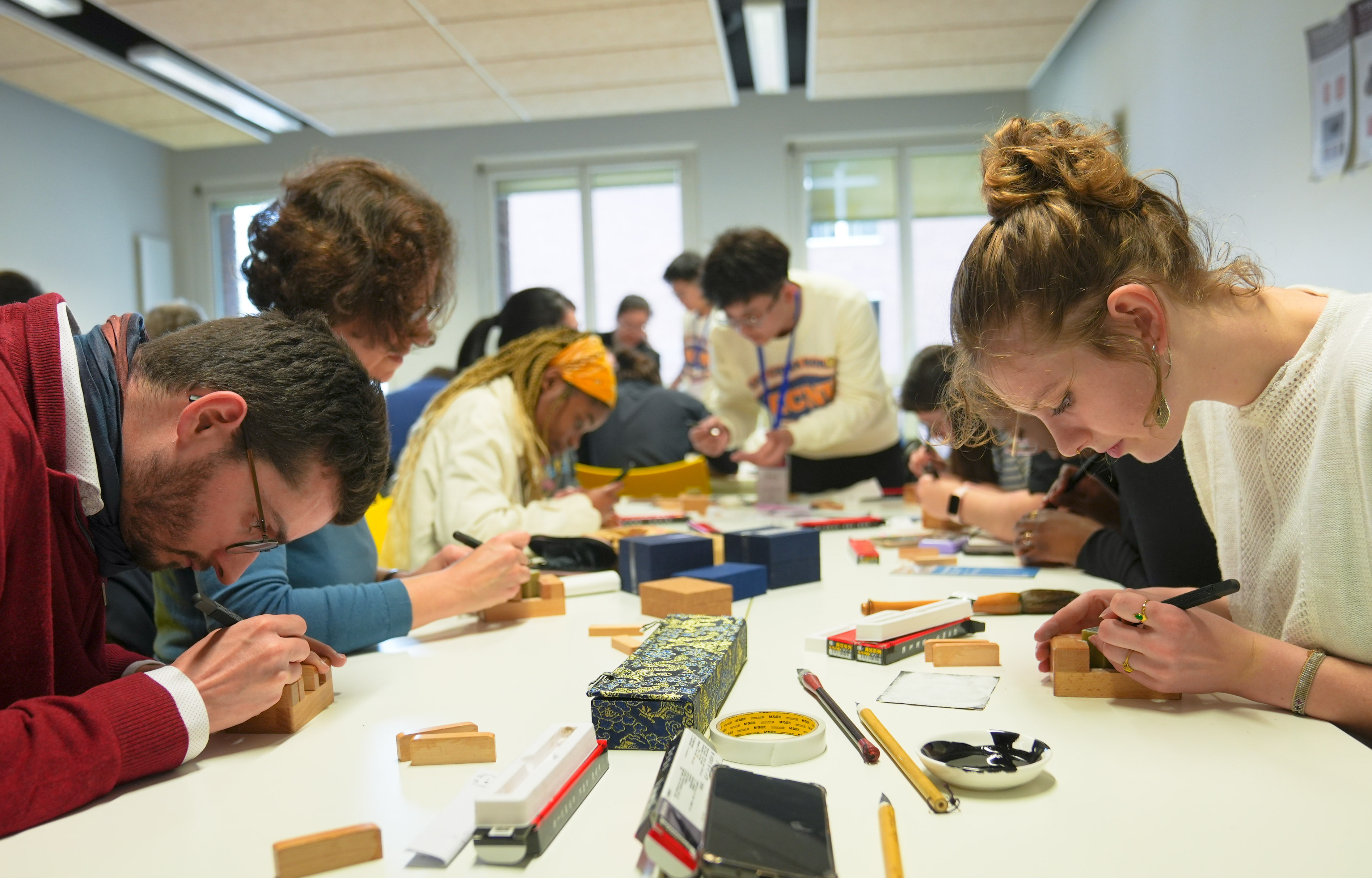 當(dāng)?shù)貢r(shí)間5月2日,在巴黎東方語(yǔ)言文化學(xué)院內(nèi),華東師大美術(shù)學(xué)院崔樹(shù)強(qiáng)教授與教育部中華優(yōu)秀傳統(tǒng)文化篆刻傳承基地主任張索教授、顧琴教授帶領(lǐng)書(shū)法篆刻碩士研究生杜家航、程羽瑄、蔡崢指導(dǎo)巴黎東方語(yǔ)言文化學(xué)院師生進(jìn)行書(shū)印體驗(yàn)。