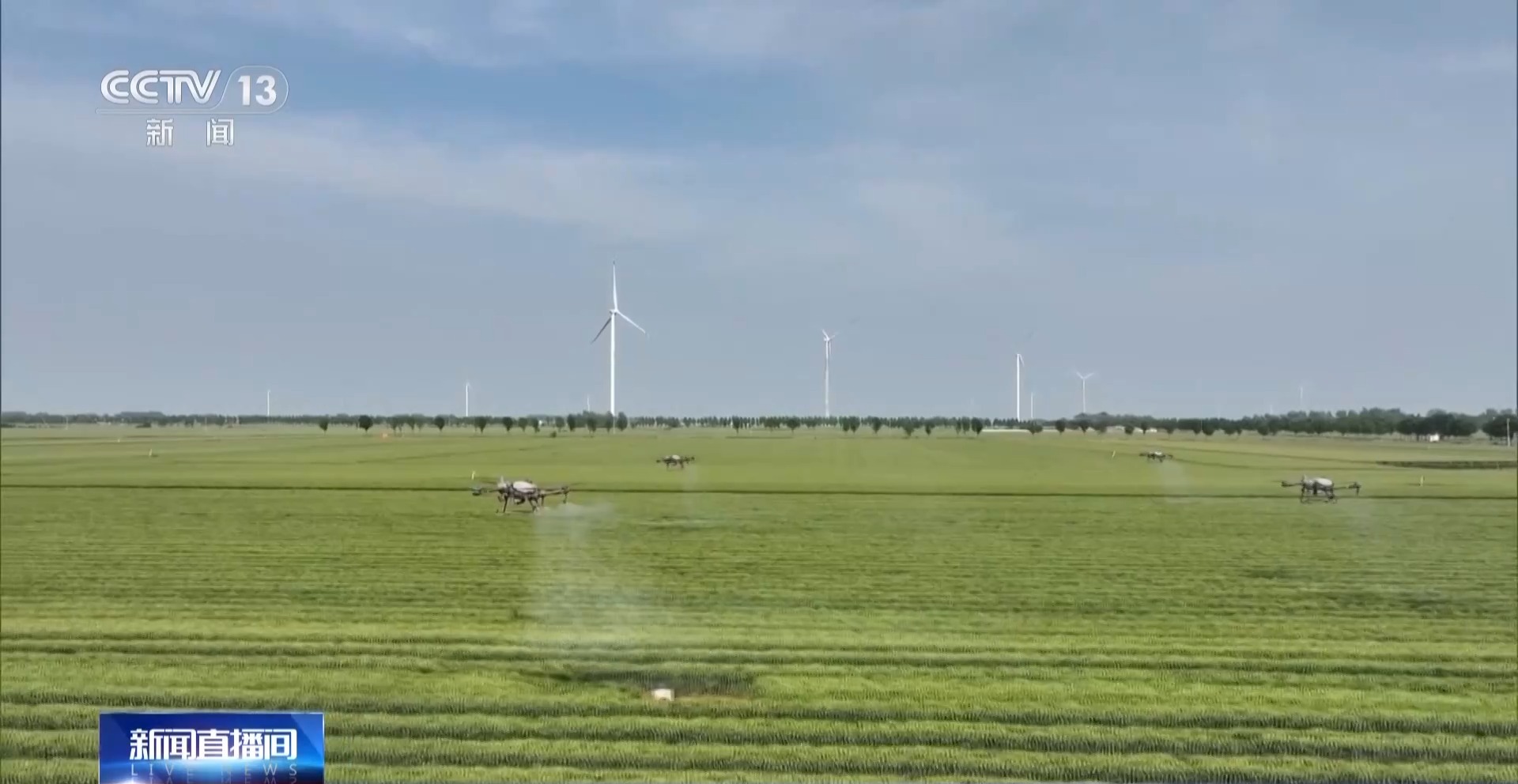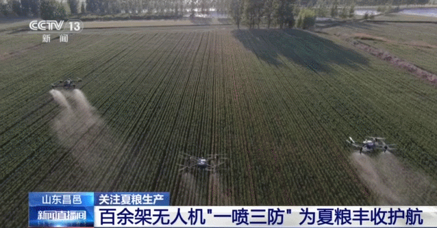 眼下正是小麥灌漿關(guān)鍵期,在山東省昌邑市柳疃鎮(zhèn)青阜農(nóng)業(yè)綜合體的一片高標(biāo)準(zhǔn)農(nóng)田里,幾架飛防無(wú)人機(jī)一字排開,白色水霧均勻噴灑在綠油油的麥田里。