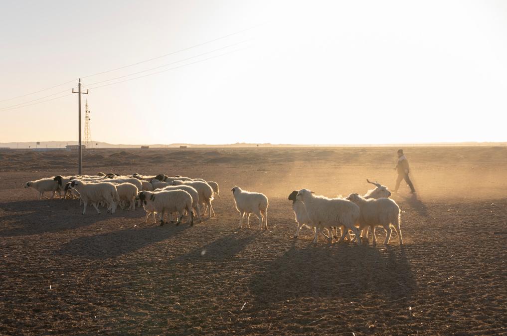 在內蒙古阿拉善左旗烏力吉蘇木溫都爾毛道嘎查,牧民朝勒門格爾勒在晨光中放羊(2023年11月17日攝)。新華社記者 才揚 攝