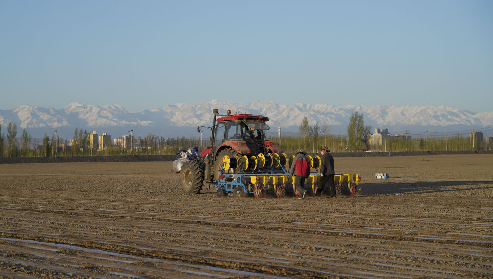 從哈衣繞拉管理的棉田向南望去,可見綿延起伏的天山山脈,終年不化的積雪、線條硬朗的山脊、若隱若現(xiàn)的云杉,像一幅氣勢(shì)磅礴的風(fēng)景畫。一臺(tái)高大的機(jī)器正按照北斗導(dǎo)航設(shè)計(jì)的路線筆直地行進(jìn),車尾安裝的自動(dòng)化播種設(shè)備將透明的薄膜、黑色的滴灌帶、紅色的包衣棉籽,一并整齊地埋進(jìn)褐色的泥土里。