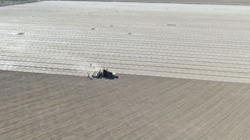 2024年4月23日,在新疆沙灣市,播種機(jī)在棉田里播種棉花(無人機(jī)照片)。