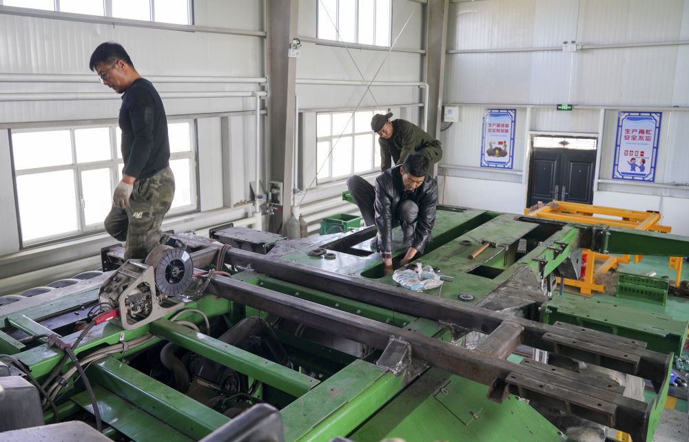 2024年4月18日,在新疆沙灣市,工作人員在韓波的農(nóng)機(jī)專業(yè)合作社改裝農(nóng)機(jī)。