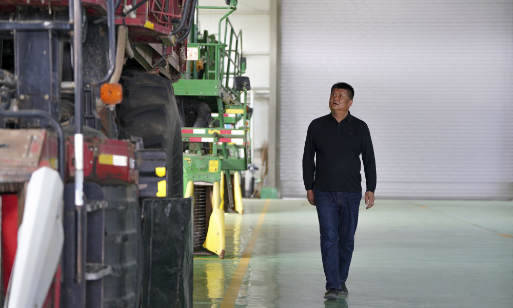 2024年4月18日,在新疆沙灣市,韓波在農(nóng)機(jī)專業(yè)合作社車間查看農(nóng)機(jī)。