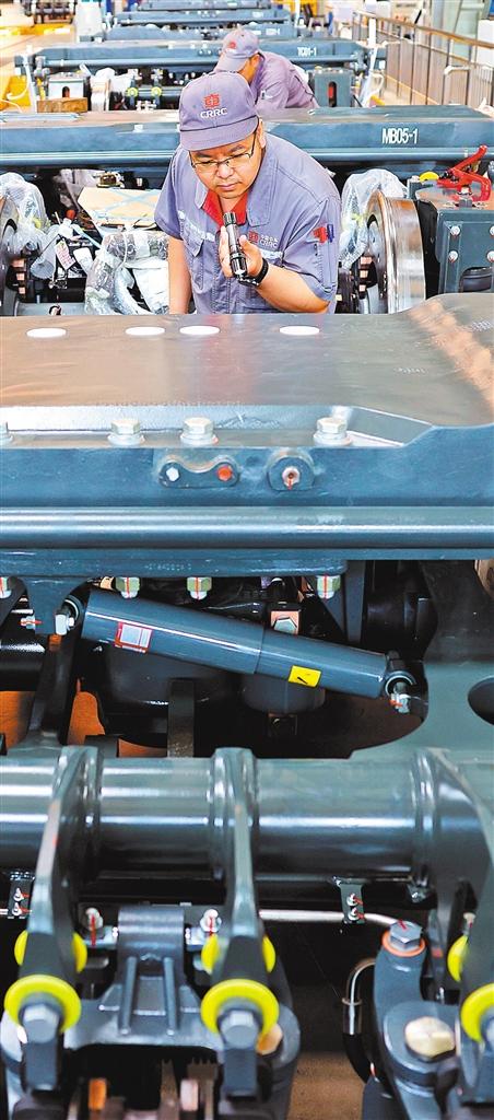 ?5月28日,中車(chē)長(zhǎng)客轉(zhuǎn)向架事業(yè)部總成產(chǎn)線組,一臺(tái)臺(tái)轉(zhuǎn)向架排列在數(shù)字化智能產(chǎn)線上。