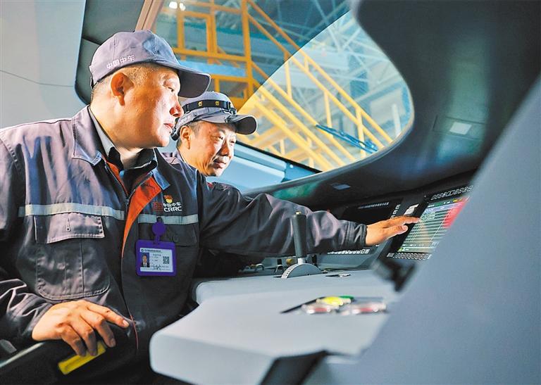 ?5月28日,中車(chē)長(zhǎng)客首席操作師羅昭強(qiáng)(前一)在對(duì)新一批復(fù)興號(hào)智能動(dòng)車(chē)組進(jìn)行出廠前的質(zhì)量檢查。