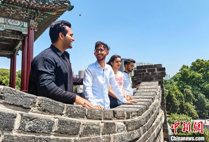 圖為邯森等4名巴基斯坦留學(xué)生登上叢臺。王倩倩攝