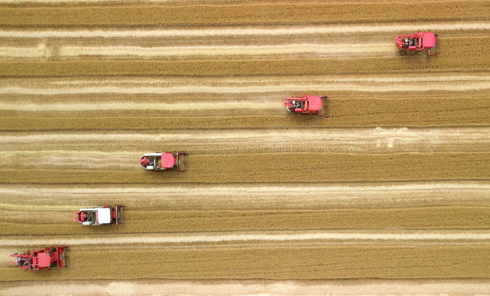 麥浪翻滾,沃野生金。麥田中,10臺收割機依次排開;一聲令下,農(nóng)機手駕駛收割機勻速前行,風中搖曳的麥穗被吸入“腹中”,田間只剩下短短的麥茬。