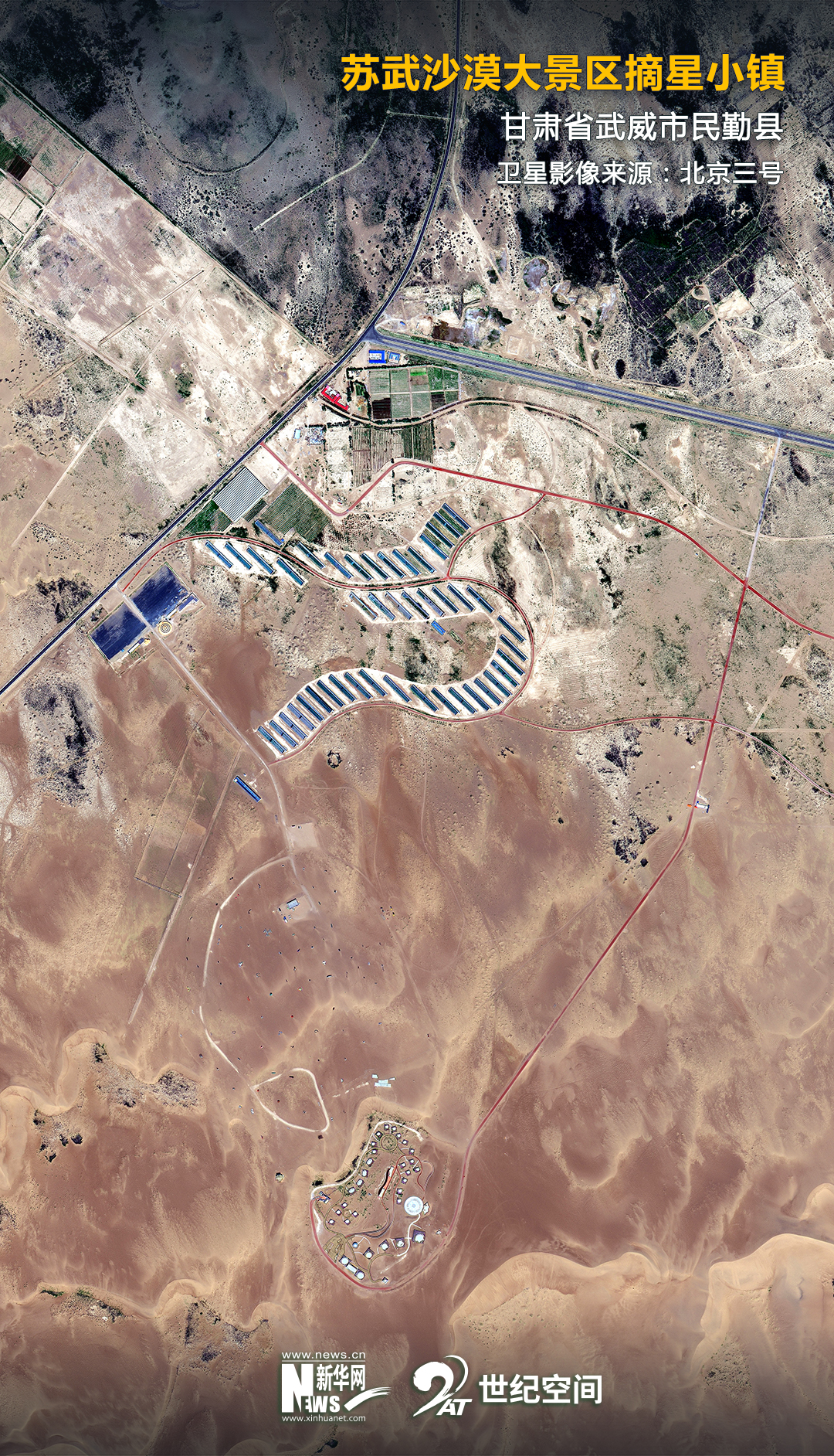 這是甘肅省民勤縣沙漠腹地的“摘星小鎮(zhèn)”(2021年3月4日攝,無人機(jī)照片)。新華社記者 郎兵兵 攝