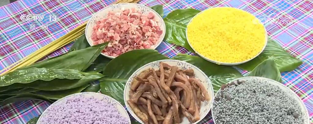 在云南曲靖市師宗縣五龍壯族鄉(xiāng),每年端午,當(dāng)?shù)卮迕窬蜁?huì)用染出色彩繽紛的“花米飯”作為原料,再加入火腿、臘肉、大棗等輔料制作“七彩粽”。