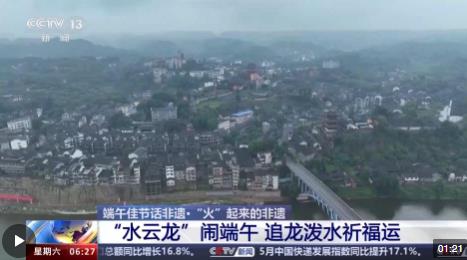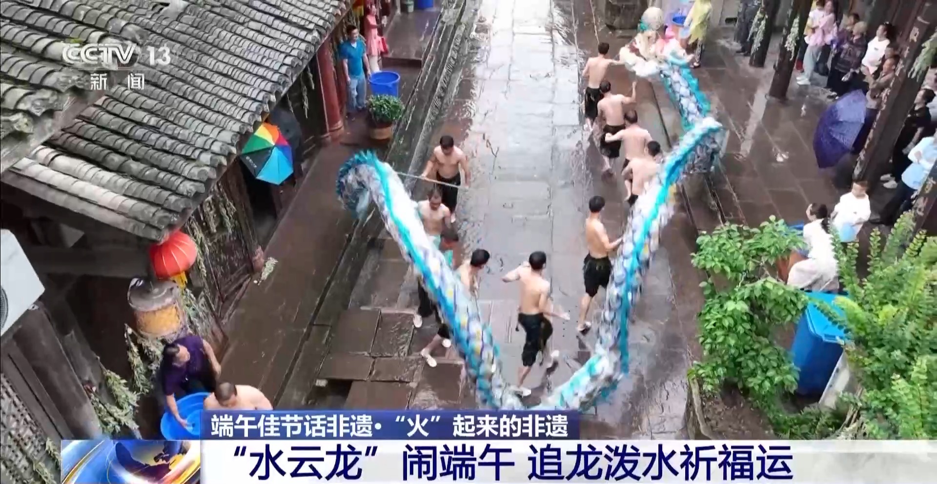 總臺(tái)記者 牟亮:我現(xiàn)在所在的位置就是重慶市銅梁區(qū)的安居古城,在我身后正在進(jìn)行端午節(jié)的非遺文化表演,這是水云龍的表演。10名赤膊的漢子正在舞動(dòng)一條18米的藍(lán)色水云龍,整條龍上下翻騰,左右騰挪,在兩邊明清時(shí)期的老屋之間穿行。而站在兩旁的居民和游客,會(huì)拿著水瓢或者水盆,將清水潑向正在舞動(dòng)的水云龍。雖然水云龍所到之處,大家衣衫都可能打濕,但是大家都樂(lè)在其中。