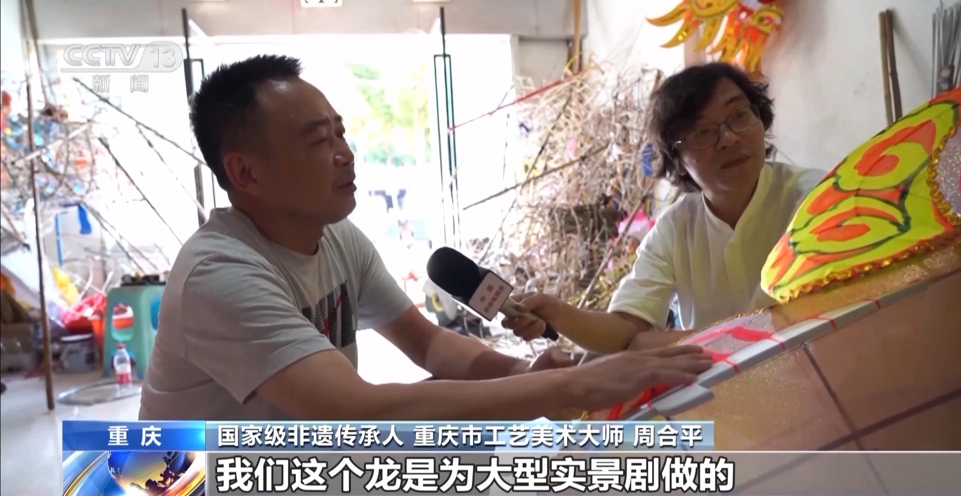 國(guó)家級(jí)非遺傳承人 重慶市工藝美術(shù)大師 周合平:我們這個(gè)龍是為大型實(shí)景劇做的,是一種夜光絨材質(zhì),是熒光色。