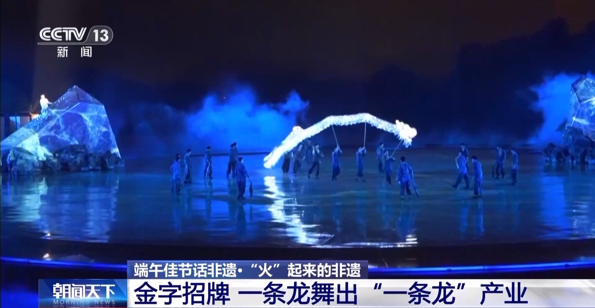 非遺的核心技藝在生產(chǎn)實(shí)踐中得到傳承。眼下,光是龍燈扎制業(yè)務(wù),已經(jīng)遍布全國(guó)十幾個(gè)省份,平均每年訂單超過(guò)1000萬(wàn)元。如今,扎制好的龍燈,更多是被用在當(dāng)?shù)氐凝埼璞硌萆稀_@是大型非遺山水實(shí)景劇《追夢(mèng) 銅梁龍》的演出現(xiàn)場(chǎng),觀眾可以看到水云龍、荷花龍等十幾種銅梁傳統(tǒng)龍舞,其中壓軸戲,便是銅梁火龍。