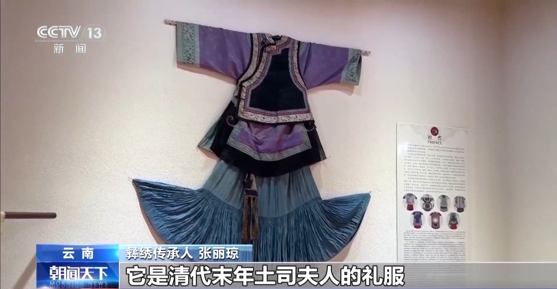 彝繡傳承人 張麗瓊:這一套彝族服飾,有100多年了,它是清代末年土司夫人的禮服。它整套服飾都是絲綢制作出來(lái)的,裙子就是彝族最有代表性的百褶裙,非常輕盈。