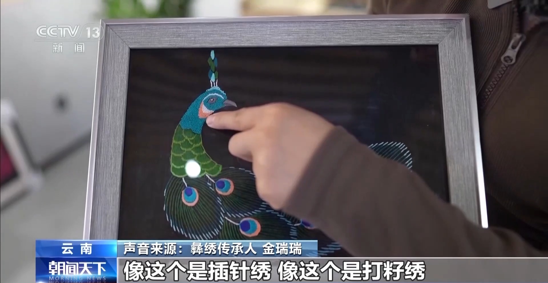 總臺(tái)記者 李騰飛:楚雄是全國(guó)兩個(gè)彝族自治州之一,這里有句話叫“十里不同天,隔山不同服”,說(shuō)的就是彝繡的豐富與多樣。我身后就陳列展示著許多有代表性的彝繡作品。