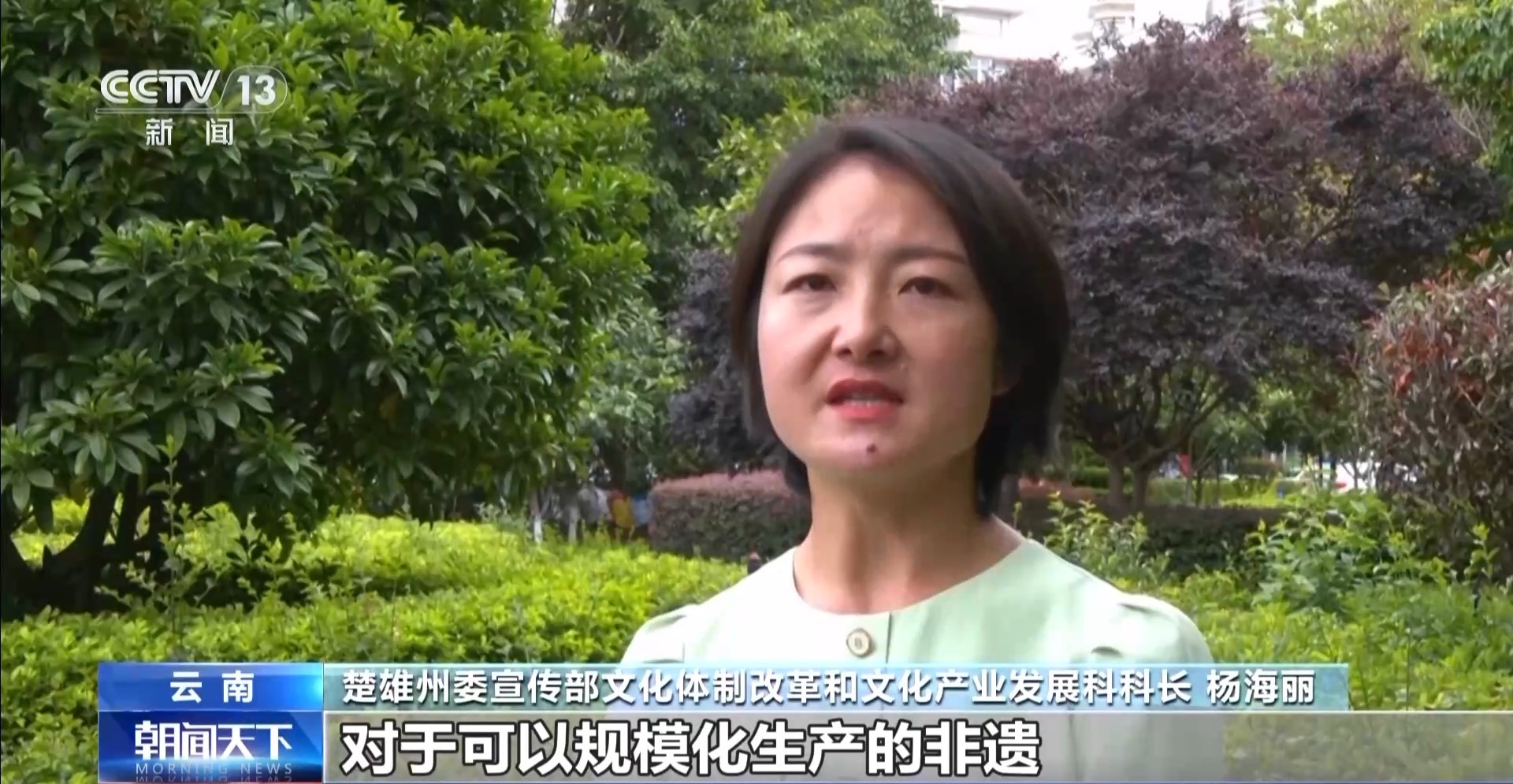 楚雄州委宣傳部文化體制改革和文化產(chǎn)業(yè)發(fā)展科科長(zhǎng) 楊海麗:對(duì)于可以規(guī)?;a(chǎn)的非遺,我們提倡生產(chǎn)性保護(hù)。適當(dāng)引導(dǎo)非遺工藝加大與創(chuàng)意設(shè)計(jì)的融合力度,推動(dòng)產(chǎn)品開發(fā)向多元領(lǐng)域拓展,變成文化產(chǎn)品、時(shí)尚產(chǎn)品、潮流產(chǎn)品。