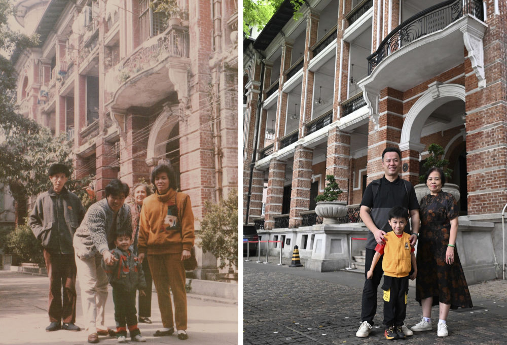 杜煜杰手拿一張老照片,攜母親和兒子重回廣州荔灣區(qū)沙面大街舊居樓前,30多年后再拍合影時,回憶瞬間涌上心頭:“我清楚地記得當(dāng)時全家人要去廣州文化公園觀賞菊展,出發(fā)前,我們拍下了這張彩色合照。”