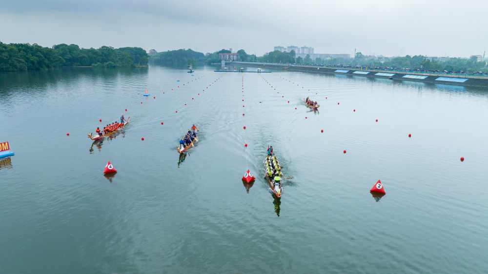 圖為6月10日端午節(jié)在重慶舉行的“大足石刻杯”成渝雙城經濟圈龍舟邀請賽決賽現(xiàn)場。(瞿波 攝)