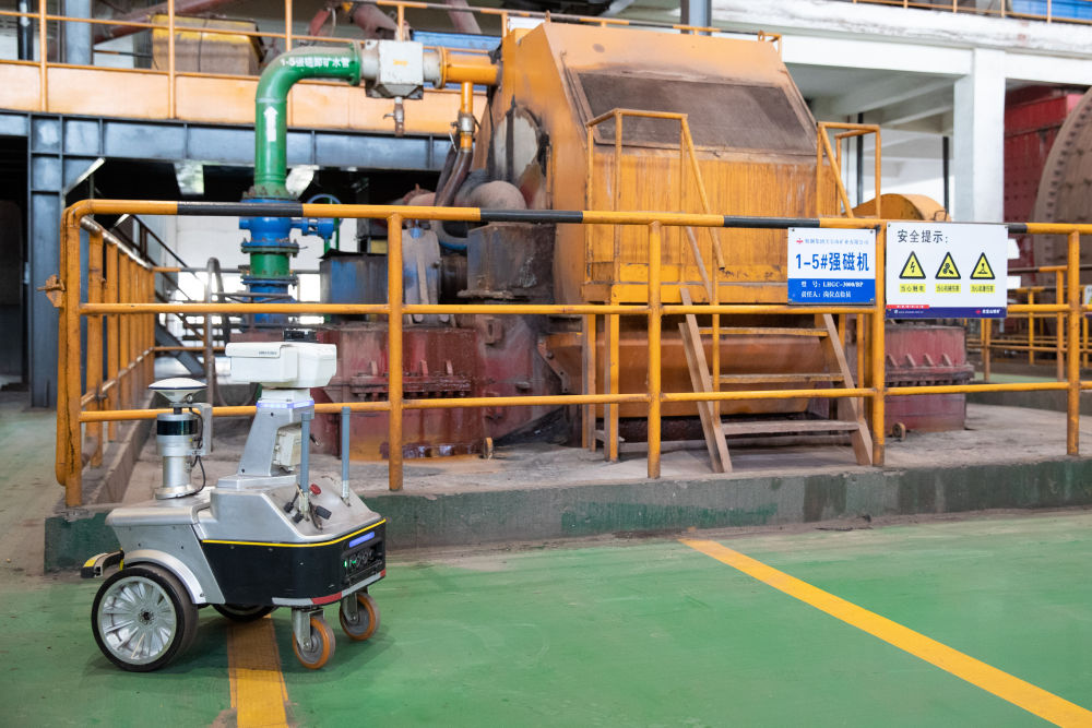 生產(chǎn)現(xiàn)場無人化,依靠什么來實現(xiàn)?步入磨磁車間,巨大的轟鳴聲在這個長約100米、寬約50米、高約30米的廠房內回響。登上二樓作業(yè)平臺,兩臺直徑6.2米的大型球磨機上的轉輪正在飛速旋轉。不遠處,磨磁巡檢機器人閃爍著燈光,正在采集設備溫度、振動等狀態(tài)數(shù)據(jù)。