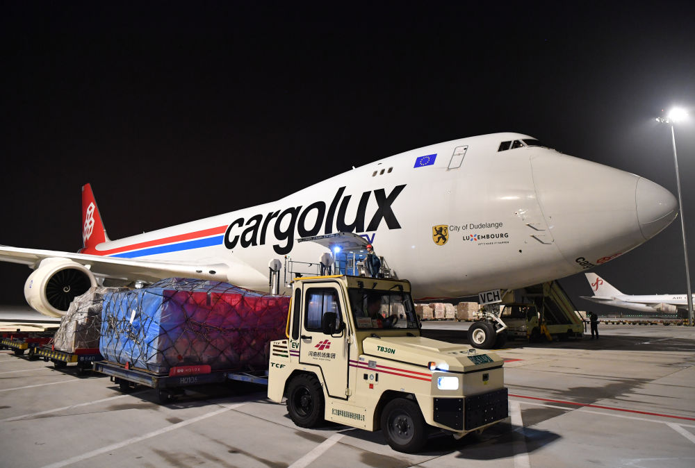 在鄭州新鄭國際機(jī)場,工作人員駕駛新能源拖車為一架盧森堡貨航貨機(jī)卸貨(2023年8月1日攝)。新華社記者 李嘉南 攝