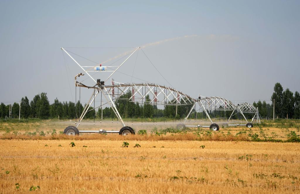 6月19日,在山東省高青縣青城鎮(zhèn),一臺大型農用澆灌設備用黃河水澆灌農田。新華社記者 徐速繪 攝