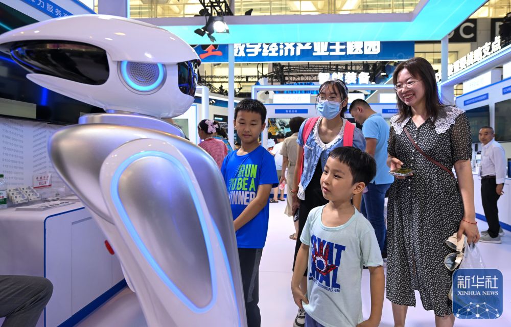 6月21日,參觀者在博覽會上和一款機器人互動。