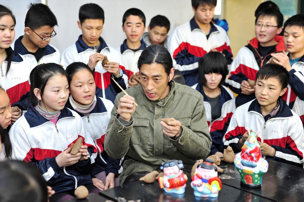 2015年1月9日,在河北省泊頭市文廟中學(xué),“三癡齋”泥塑傳承人宋長(zhǎng)峰(前中)在教學(xué)生們制作鳥(niǎo)哨。