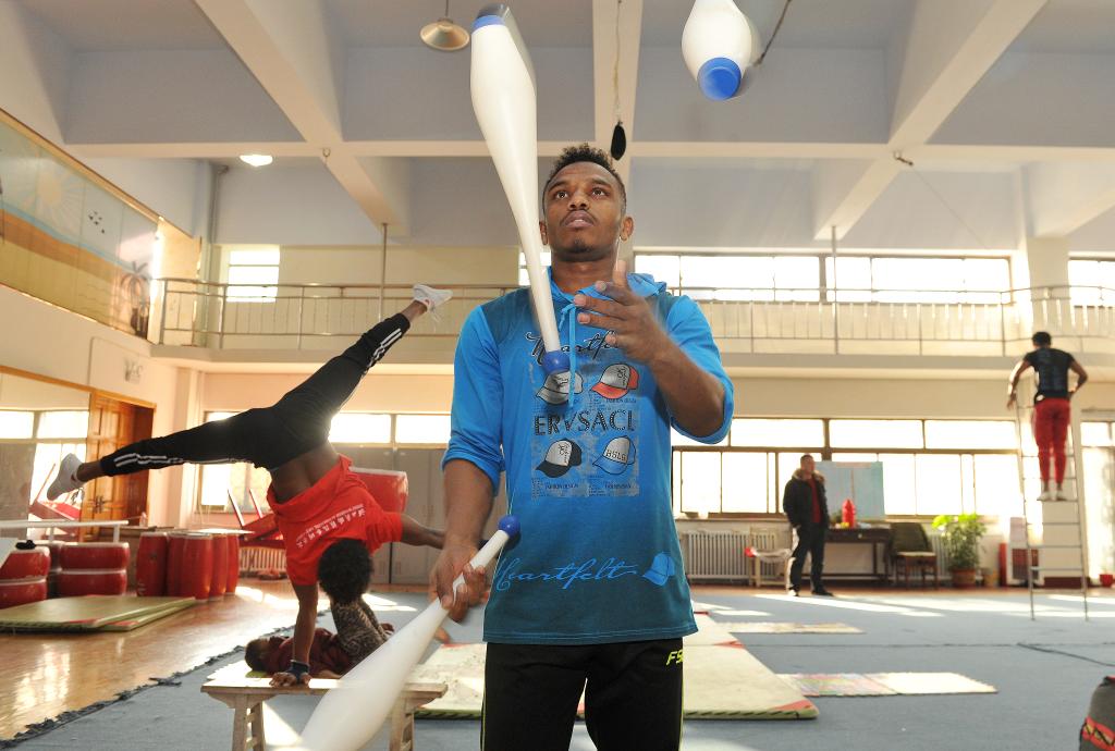 2018年1月25日,在吳橋雜技藝術(shù)學(xué)校,來(lái)自埃塞俄比亞的留學(xué)生依布薩(中)在練習(xí)雜技。