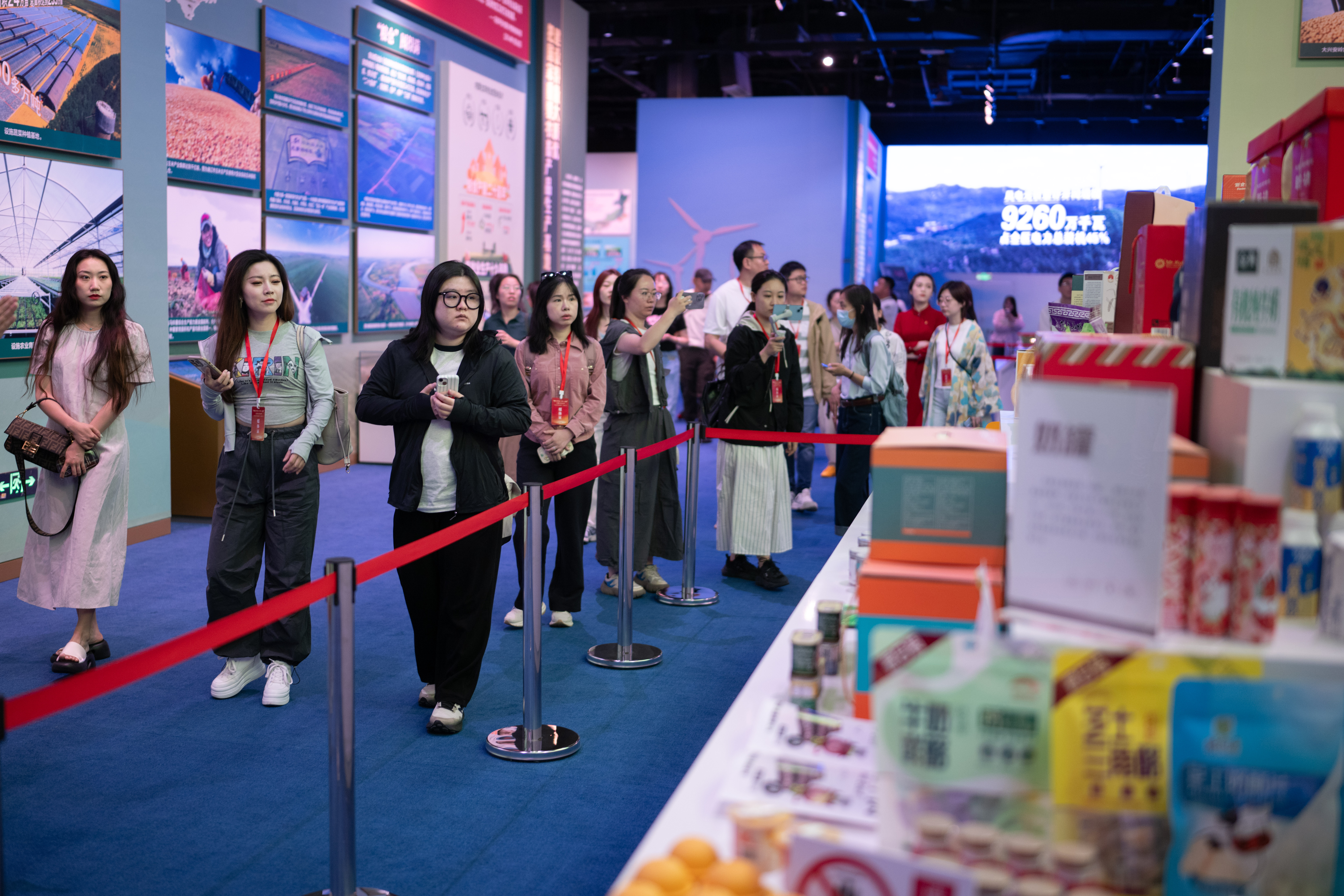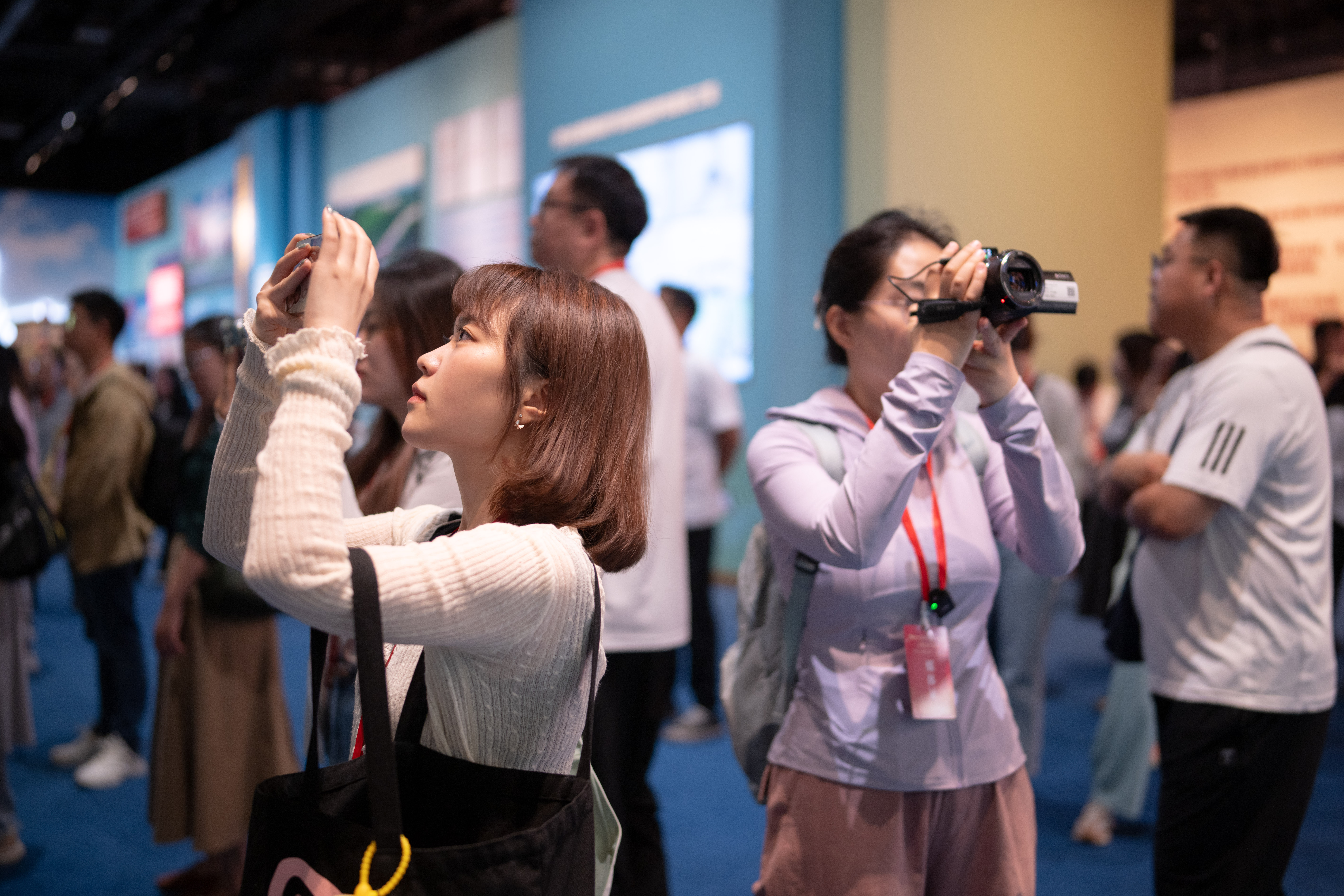 采訪團參觀“牢記囑托 感恩奮進”主題展。