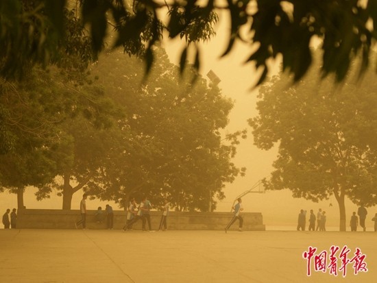 這時(shí)候,學(xué)生們?nèi)哉驹诓賵錾险f話,上課鈴響了,才慢慢踱回樓里。學(xué)校外面,路邊的人就坐在沙霧里吃燒烤,出租車大敞著窗戶載客,騎電動(dòng)車的人偶爾瞇起眼睛,沙子打得臉疼,也絕不戴口罩。之后,人們像掃雪一樣,耐心地掃去門口、窗臺(tái)上的沙土。
