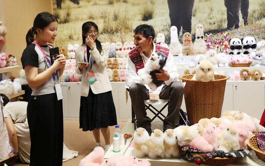 馬馬尼大叔在上海進博會“溫暖駝”品牌展臺內(nèi)向一名參觀者展示剛制作完成的羊駝玩偶(2023年11月5日攝)。新華社記者 方喆 攝