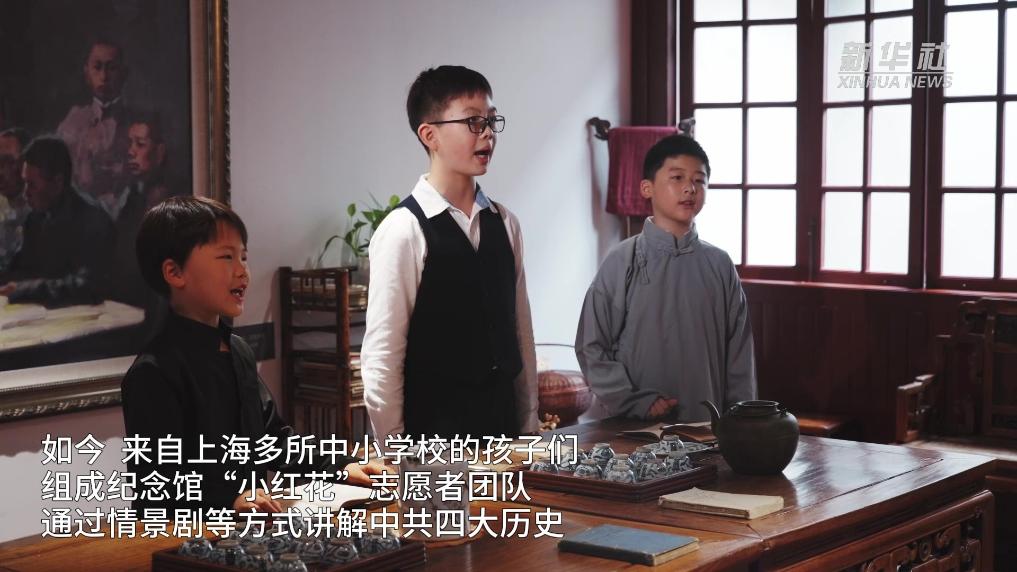紀(jì)念館場景再現(xiàn)廳還原了當(dāng)年廣吉里的會議場景:一塊寫著英文的黑板,長條桌邊圍著一圈木凳。如今,這個(gè)場景成為“紅色課堂”,來自上海多所中小學(xué)校的孩子們組成紀(jì)念館“小紅花”志愿者團(tuán)隊(duì),通過情景劇等方式,講解中共四大歷史。
