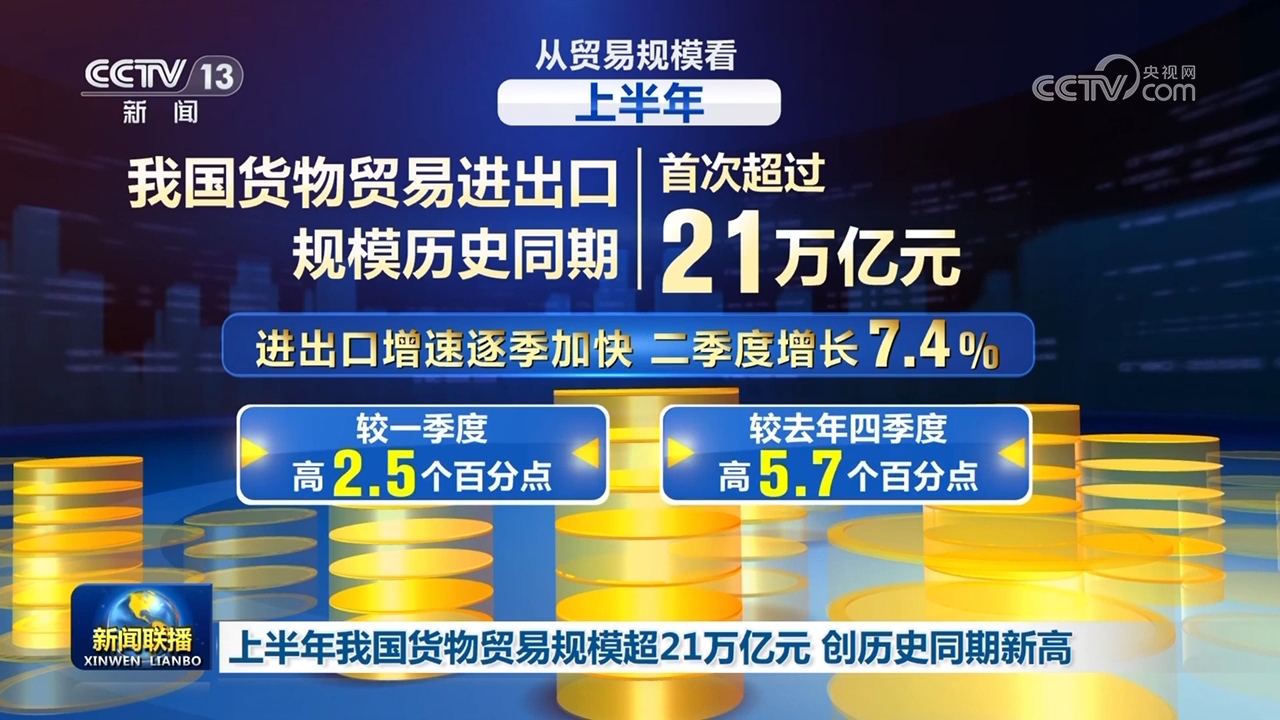 從貿易規(guī)??矗习肽?,我國貨物貿易進出口規(guī)模歷史同期首次超過21萬億元。進出口增速逐季加快,二季度增長7.4%,較一季度和去年四季度分別高2.5個、5.7個百分點,貨物貿易進出口質量持續(xù)提升、規(guī)模較快增長。