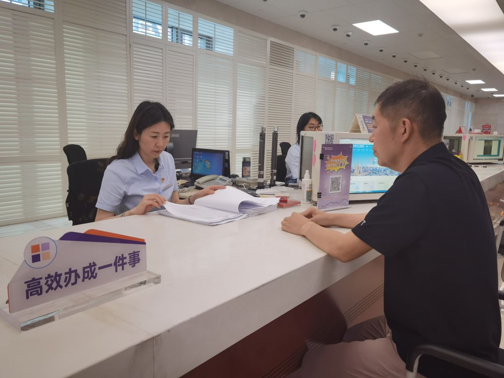 7月17日,在天津濱海新區(qū)政務(wù)服務(wù)中心“高效辦成一件事”專區(qū),企業(yè)負責(zé)人正在提交申請材料。新華社記者楊文 攝